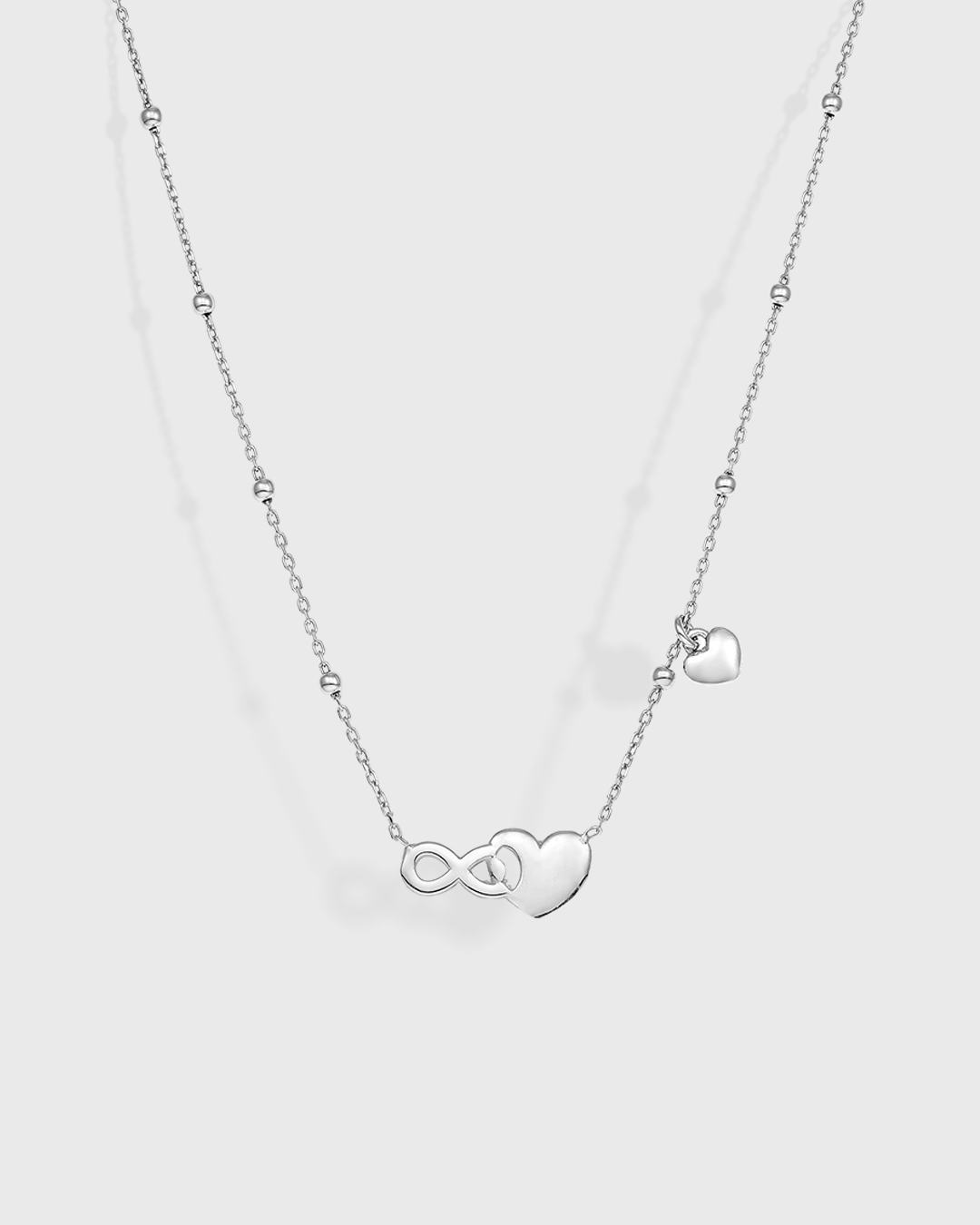 Περιγραφή:Κολιέ με άπειρο με καρδιά και κρεμαστή καρδιά με μπίλιες στην αλυσίδα.