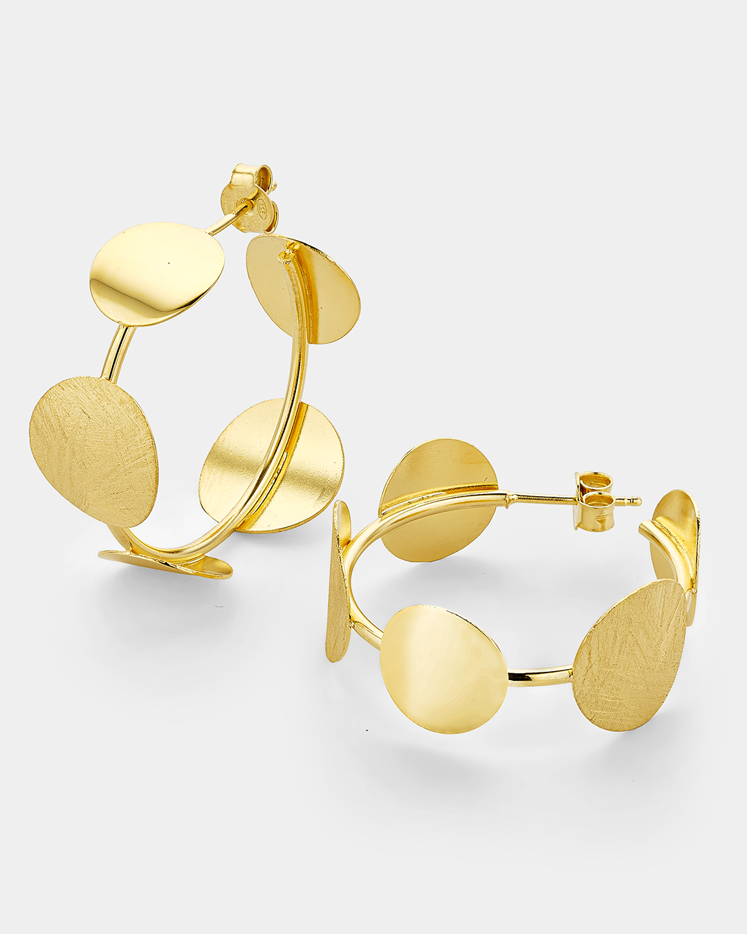 Περιγραφή:Σκουλαρίκια κρίκοι καρφωτά με κύκλους λουστρέ και σατινέ.