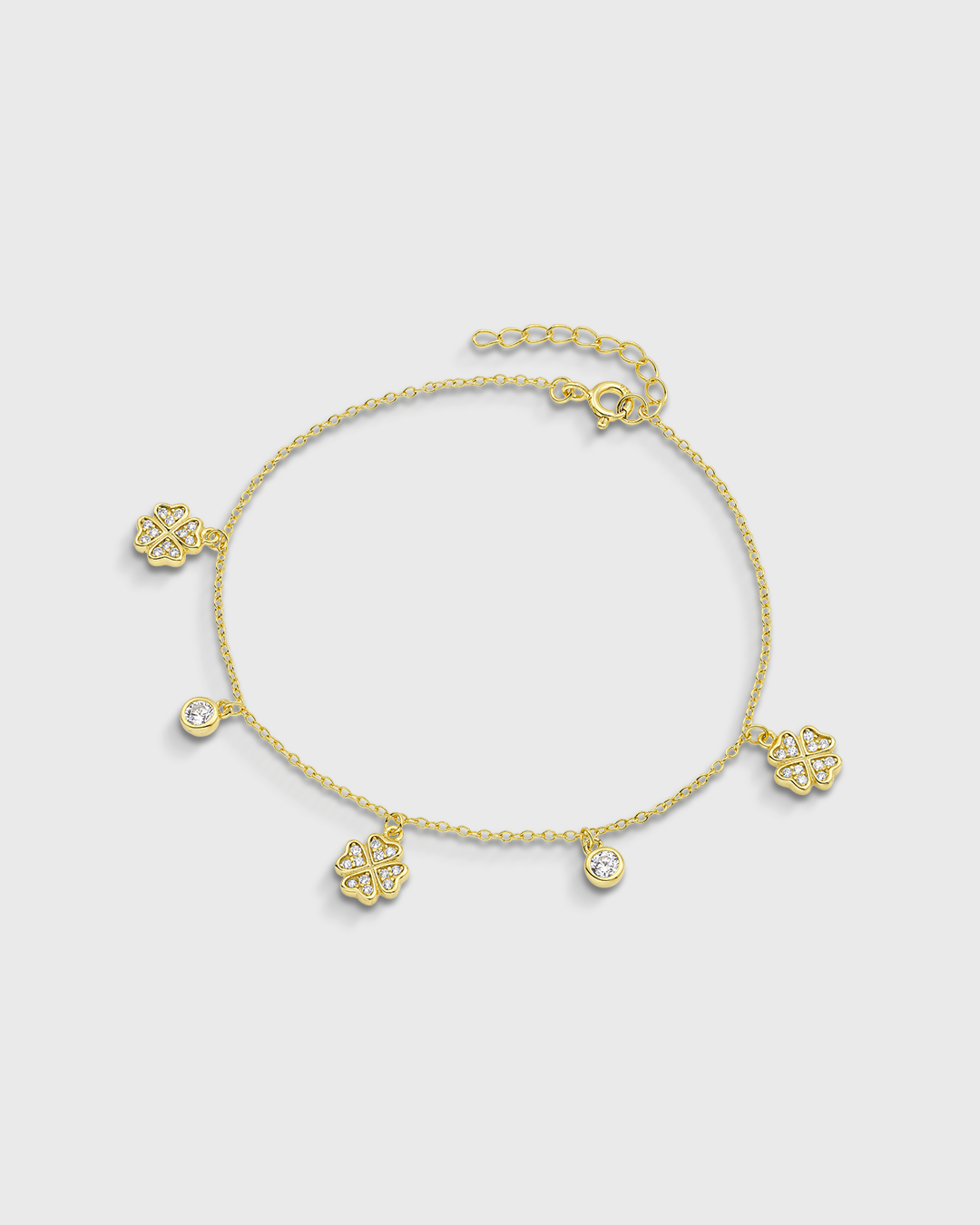 Περιγραφή: Βραχιόλι με τετράφυλλα τριφύλλια με ενδιαμεσα στρόγγυλα ζιργκόν.